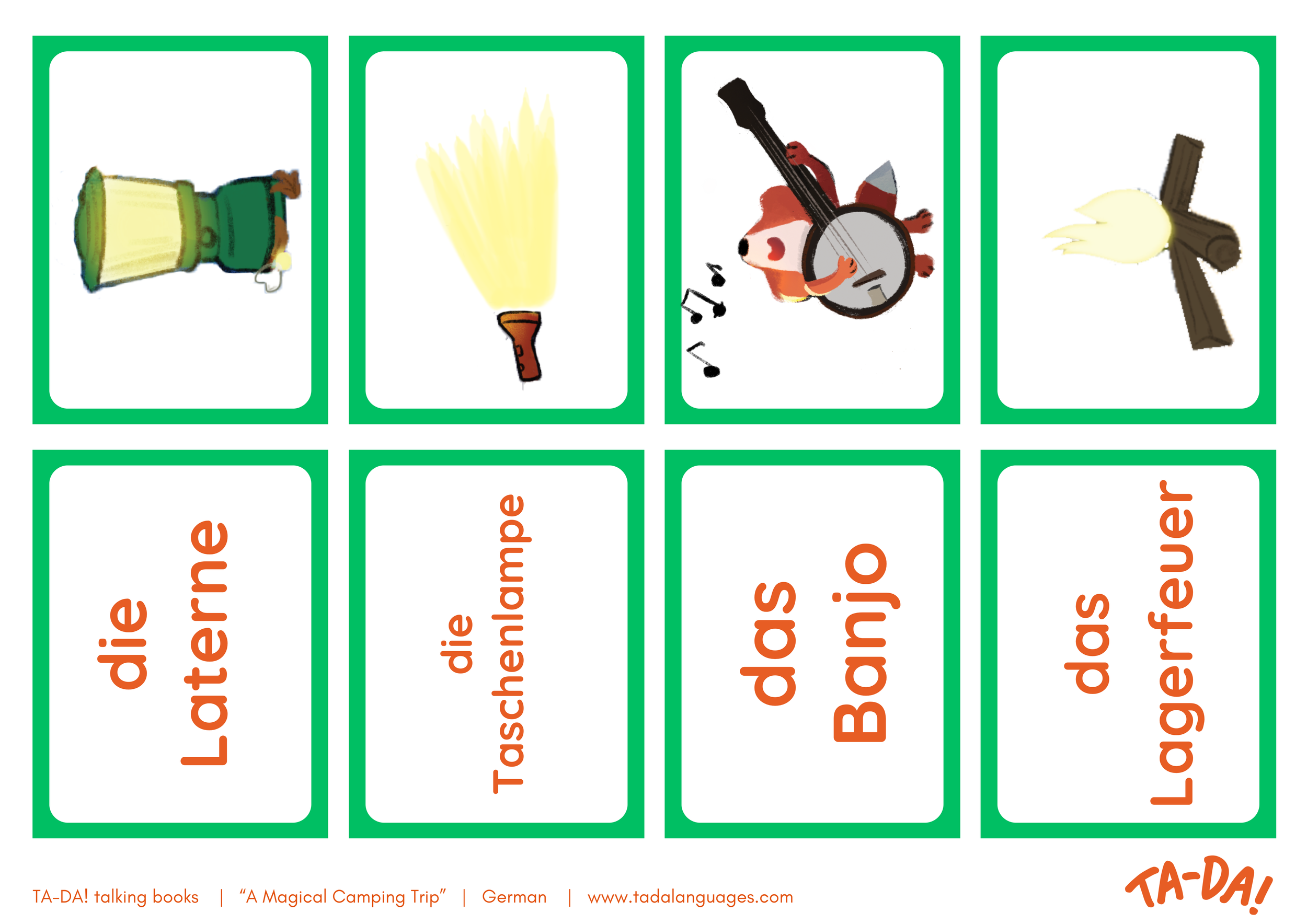 Tactile Cards: Enhance flashcards by adding textures. Stick on small branches or slivers of wood; or a piece of tent-like material for camping-related words. It’s a tactile way to connect the word to the real world.